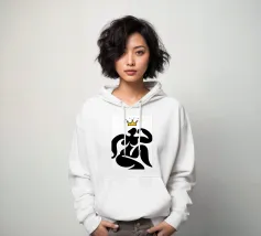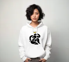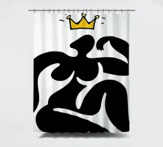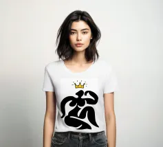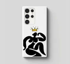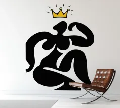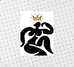 Een gedurfde, abstracte figuur poseert dynamisch onder een gele kroon, wat een gevoel van macht suggereert. Het minimalistische ontwerp benadrukt sterke, gebogen lijnen.