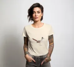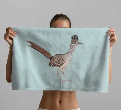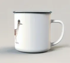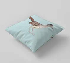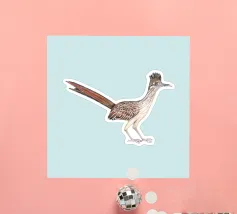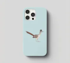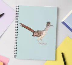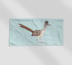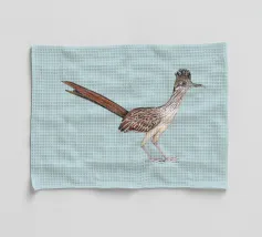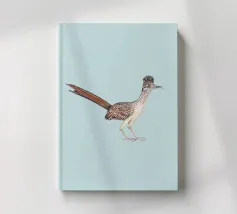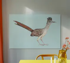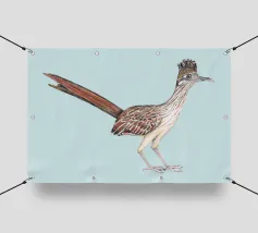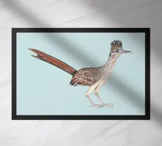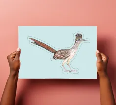 Een potloodtekening in kleurpotloden van een roadrunner. Je ziet de vogel van opzij, zodat zijn lange staart mooi in beeld komt.
