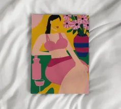 Een zelfverzekerde vrouw in een fuchsia bikinitopje en korte broek ontspant in een stoel met een drankje, omringd door planten en bloemen, die zomerse ontspanning belichamen.
