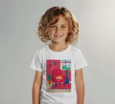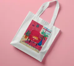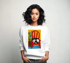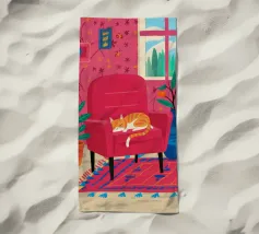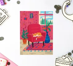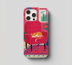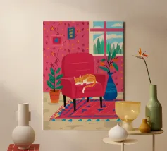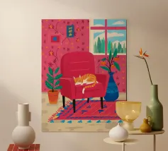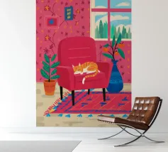 Een close-up van een kat die vredig slaapt op een felrode fauteuil. De scène is eenvoudig en hartverwarmend, gericht op het comfort en de rust van een huisdier in een kleurrijke, moderne omgeving.
