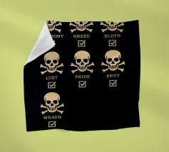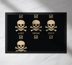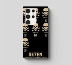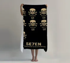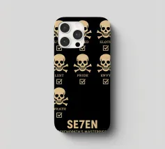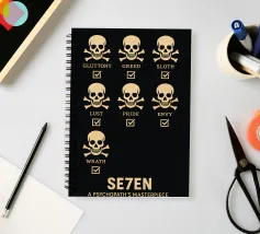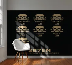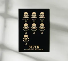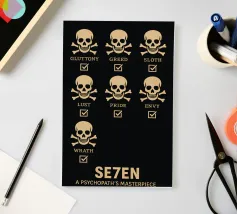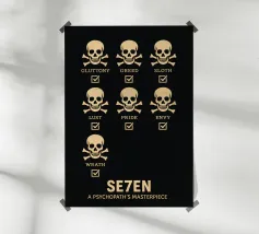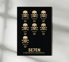 Seven Print, alternatieve filmposter, minimalistische muurkunst, zwart-wit, doodskoppen, zeven hoofdzonden, neonoir, vinkje, filmfans cadeau