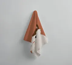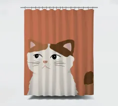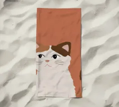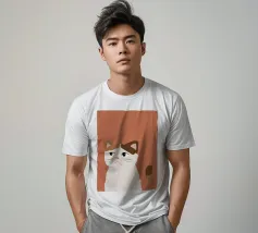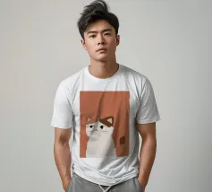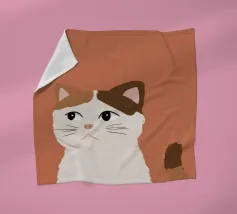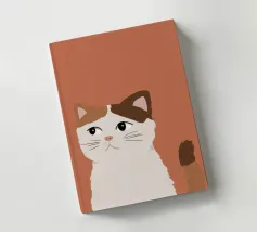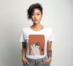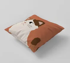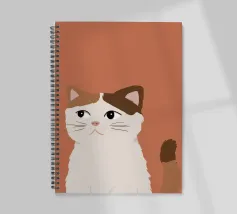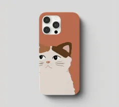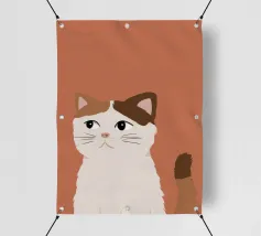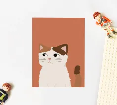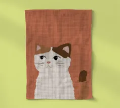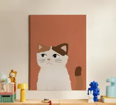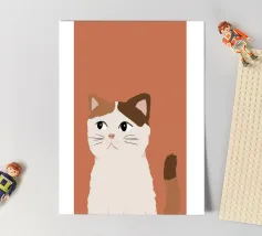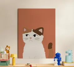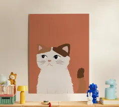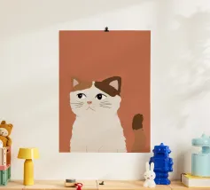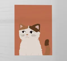 Een gestileerd portret van een calico kat met een duidelijk norse of sceptische uitdrukking. De eenvoudige, warme terracotta achtergrond maakt het karaktervolle gezicht van de kat de onmiskenbare focus van het stuk.