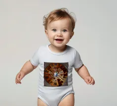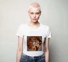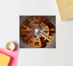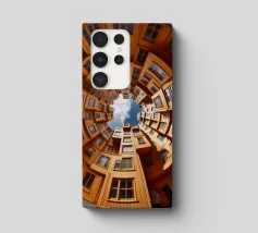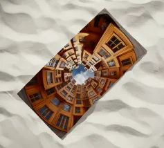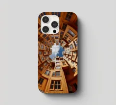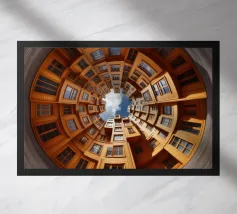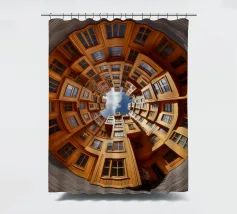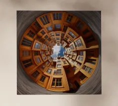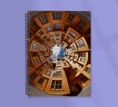 Deze afbeelding toont een verbluffende architecturale compositie van houten gebouwen in een cirkel, gezien vanaf de grond. Het gebogen perspectief omlijst een helderblauwe lucht en creëert een betoverend gevoel van diepte en symmetrie.