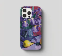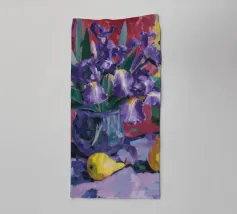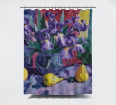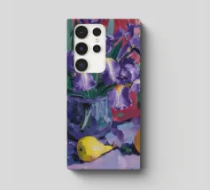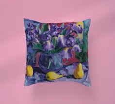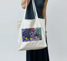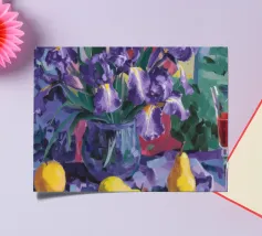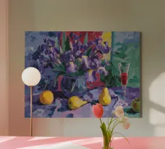 Een levendig stilleven met een boeket rijk paarse tulpen en andere complementaire bloemen in een vaas, vergezeld van felgele citroenen en een contrasterend rood object, allemaal gerangschikt op een tafel met een gedessineerd kleed tegen een energieke, kleurrijke achtergrond.
