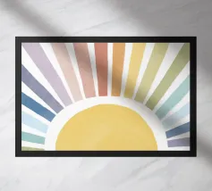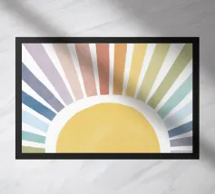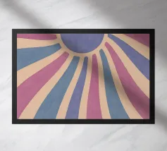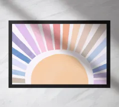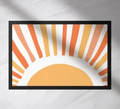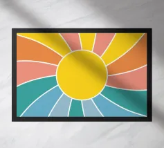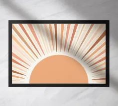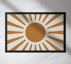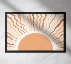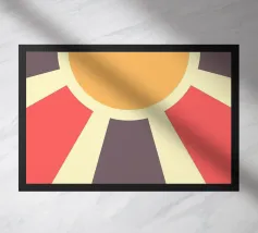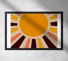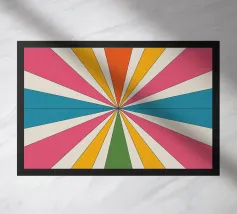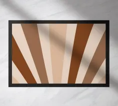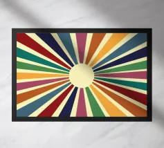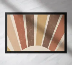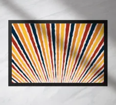Stralende lijnen in aardetinten zoals groen, bruin en oranje strekken zich uit vanuit een centrale cirkel, waardoor een zonnestraaleffect ontstaat. Het ontwerp heeft een retro-esthetiek met symmetrische patronen en een rustgevend kleurenpalet.