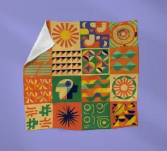 Een speelse en energieke abstracte compositie gemaakt van verschillende kleurvlakken en patronen, waaronder bloemen, rasters en strepen, als een levendige quilt.