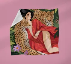 Dit kunstwerk toont een persoon in een zwarte jurk die een evenwichtige pose aanneemt naast een luipaard. De scène straalt verfijning, zelfvertrouwen en tijdloos kunstenaarschap uit.