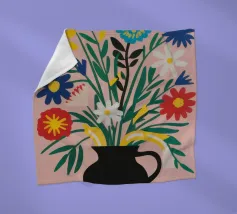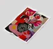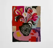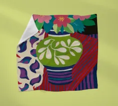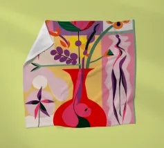 Een zeer abstract en expressief werk met bloemvormen en gedurfde patronen. Een zwarte vaas met gebarentekens houdt een chaotisch boeket vast tegen een achtergrond van beige, rode en zwarte vormen, waardoor een krachtig, modern statement ontstaat.