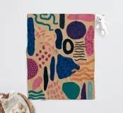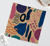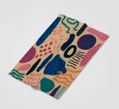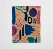 Een speelse abstracte compositie met verschillende organische en geometrische vormen en patronen in een palet van roze, blauw, oranje en zwart, die een gevoel van vrolijke beweging oproepen.