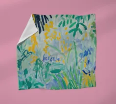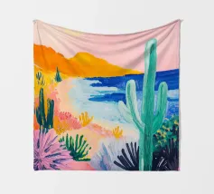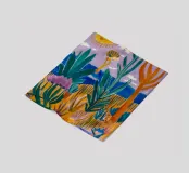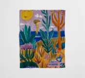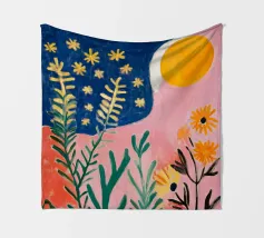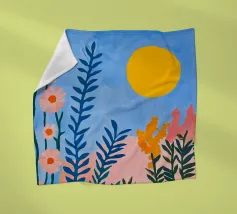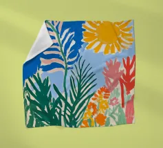 Een levendig, abstract landschap met een felle zon, palmbomen en gestileerde bloemen. De felle kleuren en moderne, grafische stijl creëren een energieke en vrolijke viering van een tropisch paradijs.