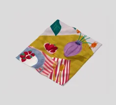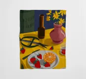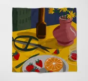 Een prachtig chaotisch stilleven van een tafel van een kunstenaar of knutselaar, met scharen, fruit en andere voorwerpen. De rijke kleuren en dynamische compositie vieren de schoonheid van creatieve rommel.