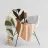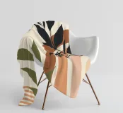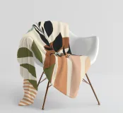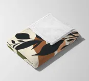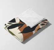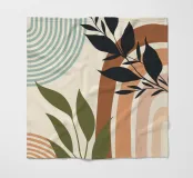 Gestileerde bladeren in zwart en groen tegen een achtergrond van vloeiende, gebogen strepen in zachte aardetinten. Het ontwerp combineert botanische elementen met abstracte geometrische vormen voor een moderne look.