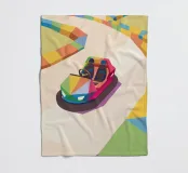 Een illustratie van een kleurrijke botsauto in een spelarena met een moderne geometrische stijl.