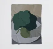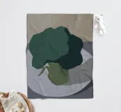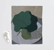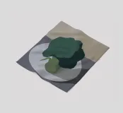 A simplistic representation of broccoli rests on a white plate against a two-toned background, showcasing shades of green and gray. The abstract style emphasizes geometric shapes and flat colors.