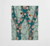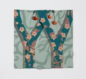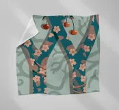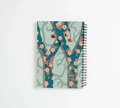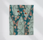 Deze prachtige illustratie toont een weelderige kersenboom met hangende rode vruchten, die een vredige en rustgevende sfeer creëren.