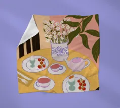 Een eenvoudige, moderne interieurscène van een gedekte tafel voor twee, met een vaas met bloemen als middelpunt. De gele muur en minimalistische setting creëren een sfeer van stille intimiteit en chique eenvoud.