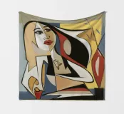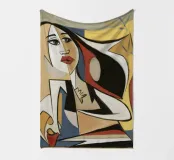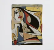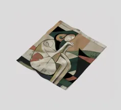 Dit kunstwerk toont een abstracte figuur in een dynamische pose, omringd door gedurfde vormen en kleuren. De compositie creëert een gevoel van beweging en energie.