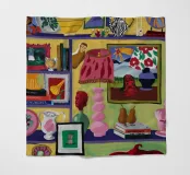Een maximalistisch interieur toont een heerlijke overvloed aan ingelijste foto's, diverse voorwerpen, kleurrijke meubels en levendige patronen, die een sfeer van artistieke en vreugdevolle verzameling creëren.