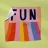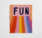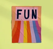 Minimalistische typografische illustratie met opvallende gekleurde strepen en een eenvoudig woord. Strakke, speelse compositie.