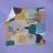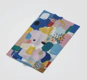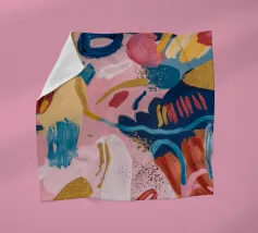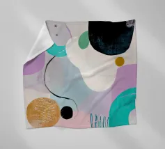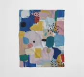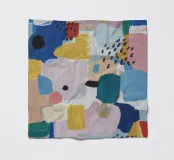 Een abstract patchwork van geschilderde, gestructureerde vormen in een gedempt palet van blauw, oker en beige creëert een verfijnde en prachtig uitgebalanceerde compositie met een artistieke, handgemaakte uitstraling.