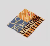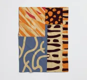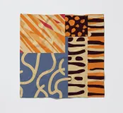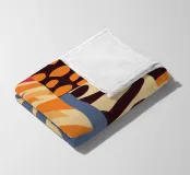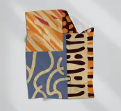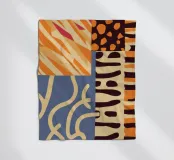 Een abstract kunstwerk samengesteld uit verschillende gestructureerde patches, waaronder dierenprints en effen kleuren zoals oranje en blauw, waardoor een visueel interessant en harmonieus modern patchwork ontstaat.