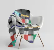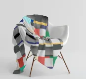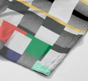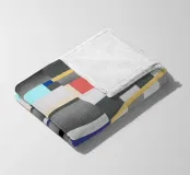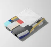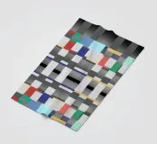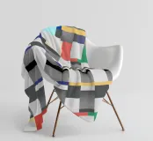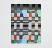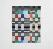 A geometric composition features a grid of colorful rectangles and squares interspersed with shades of gray, creating a modern and abstract pattern. The arrangement of different colors and gradients gives the piece a rhythmic visual flow.