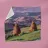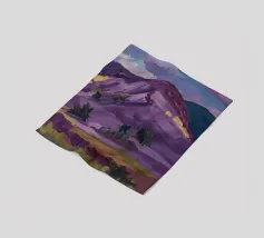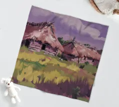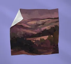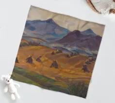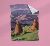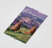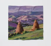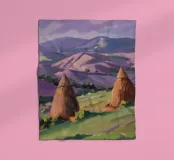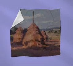 A serene landscape centered on a well-formed haystack standing in a field characterized by gently rolling hills in muted shades of purple and green, all under a soft, calm sky.