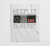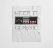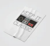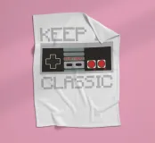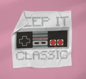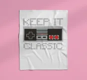 Een retro gamecontroller is afgebeeld met de zin "KEEP IT CLASSIC" in gepixeleerde tekst. Het ontwerp roept nostalgie op door de vintage esthetiek en het eenvoudige kleurenpalet.