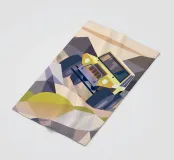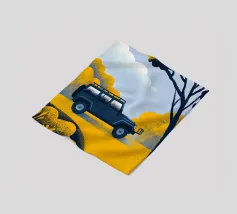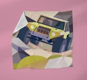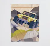 Een illustratie van een terreinwagen op rotsachtig terrein in een moderne geometrische stijl.