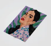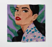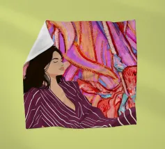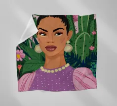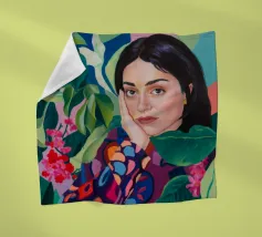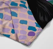 Dit kunstwerk toont een persoon die een shirt draagt met een geometrisch patroon tegen een achtergrond van groene bladeren. De focus ligt op het ingewikkelde ontwerp van het shirt en de natuurlijke elementen eromheen.