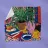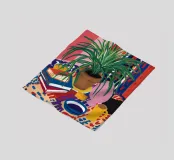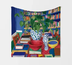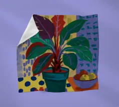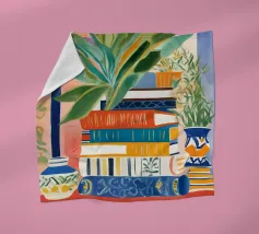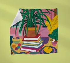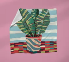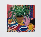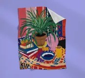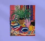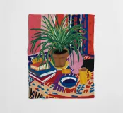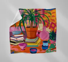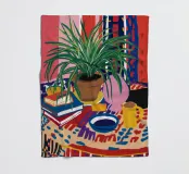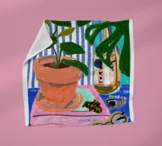 A still life of a potted plant and other objects on a table with a colorful, patterned rug underneath. The composition against a pink wall is modern, eclectic, and full of charming, decorative detail.