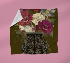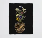 Een prachtig gedessineerde vaas bevat een levendig boeket bloemen, met een vlinder die er sierlijk op rust. De compositie bestaat uit verschillende bloemen, waaronder viooltjes, tegen een donkere achtergrond, waardoor hun levendige kleuren worden benadrukt.