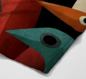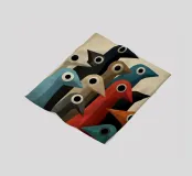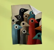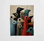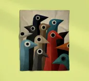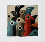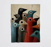 Abstracte vogelkunst met geometrische vormen in gedempte kleuren.