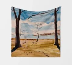 A minimalist, moody landscape where the stark, bare trees of winter are reflected perfectly in the still water of a marsh or lake, creating a symmetrical, melancholic scene.