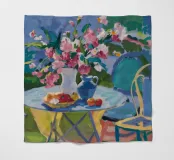 Een uitnodigend stilleven met een prachtig boeket roze en witte rozen in een vaas, elegant geplaatst op een witte tuintafel met een charmante blauwe stoel, alles in een weelderige, zonovergoten groene tuin.
