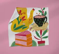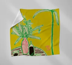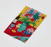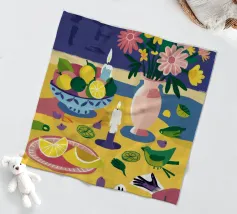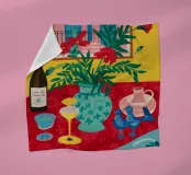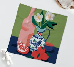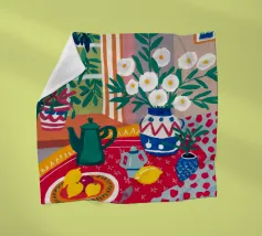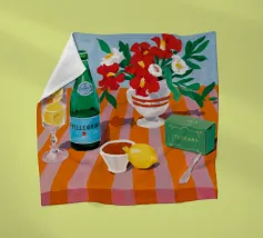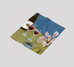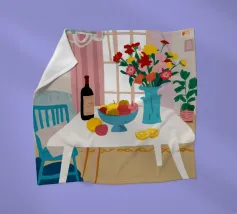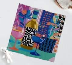 Een stilleven op een rood tafelkleed met wijnflessen, glazen, een kan en fruit, met levendige groene en gele achtergrondelementen die een feestelijk en gezellig samenzijn suggereren.
