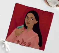 Dit kunstwerk toont een persoon in een rode trui die een haan vasthoudt. De achtergrond is donker, wat de rustieke en charmante elementen van het tafereel benadrukt.