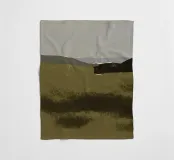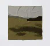 Een sereen landschap met gedempte aardetinten, met een ruig terrein dat zich uitstrekt naar een wazige horizon. Schaduwen en contrasten benadrukken de heuvels in de verte en roepen een gevoel van rust en stilte op.