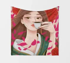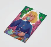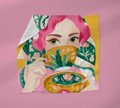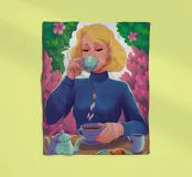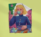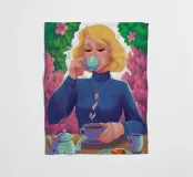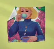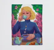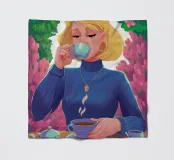 A portrait of a chic blonde woman in a blue turtleneck, enjoying a cup of tea. Her serene expression and the cozy atmosphere create a moment of elegant and peaceful repose.
