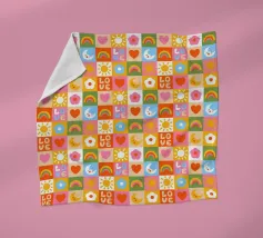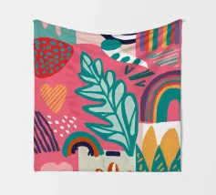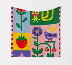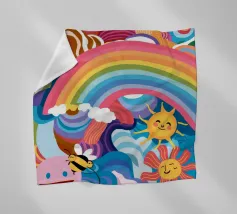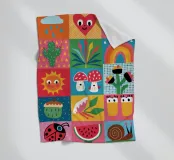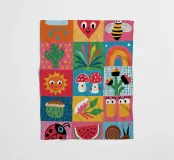 Een prachtige lappendeken van schattige en kleurrijke tuinpictogrammen, waaronder een vriendelijke bij, een regenboog, een lachende zon en een lieveheersbeestje. Dit kunstwerk is een pure uiting van vreugde en kinderlijke verwondering.