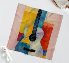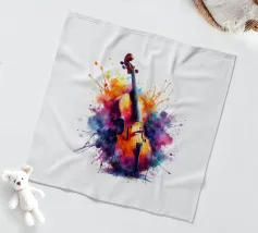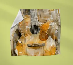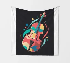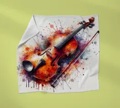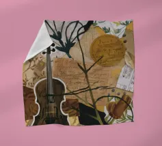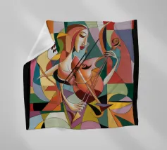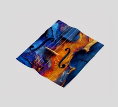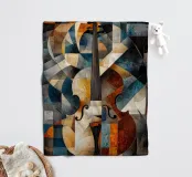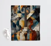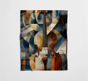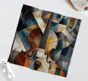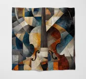 Een opvallend abstract kunstwerk met een viool in kubistische stijl, met overlappende geometrische vormen en een rijk kleurenpalet van aardetinten, blauw en goud. De compositie benadrukt textuur, diepte en beweging.