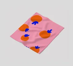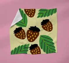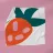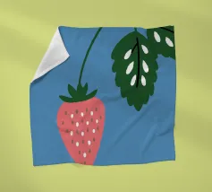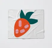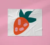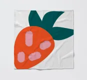 Een gestileerde, simplistische weergave van een aardbei met een oranje lichaam met drie roze zaden en donkergroene bladeren. Het minimalistische ontwerp maakt gebruik van gedurfde kleuren en vormen om een speels en modern gevoel op te roepen.