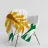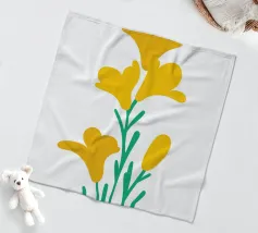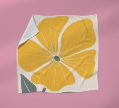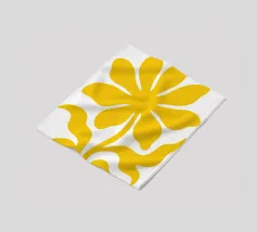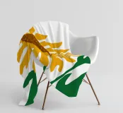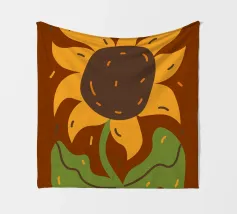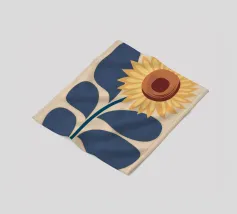 Een gestileerde zonnebloem met gele bloemblaadjes en een bruin hart is afgebeeld. Groene bladeren en stengels voegen contrast en evenwicht toe aan de compositie.