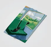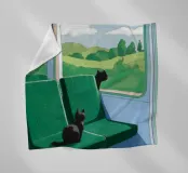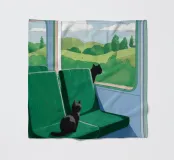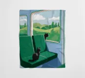 A view from a train window of a green, rolling countryside landscape. The scene is a peaceful, contemplative, and beautiful depiction of travel and the quiet joy of watching the world go by.