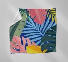 Een verfijnde compositie combineert blokken van tropische bladpatronen met effen kleurvlakken en geometrische vormen. Het patchworkontwerp in blauw-, roze- en groentinten creëert een evenwichtig en stijlvol stuk dat zowel modern als natuurlijk is.