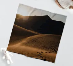 Elk duin, gevormd door de fluisterende wind, vormt gladde, gebogen richels die scherpe, elegante schaduwen werpen. Het oppervlak glinstert van de hitte en fijne zandkorrels dansen lichtjes over de top, gedragen door de bries. In deze stille, dorre wereld staan de duinen als steeds veranderende sculpturen - tijdloos, majestueus en mysterieus.