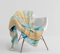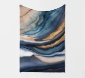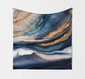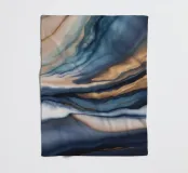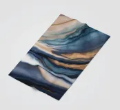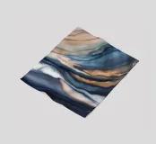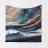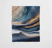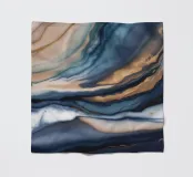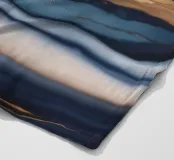 Horizontale golven van zachtbruin, crèmekleurig en diepblauw doen denken aan door de wind gebeeldhouwde kustlijnen.