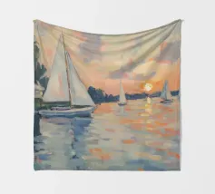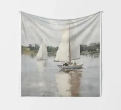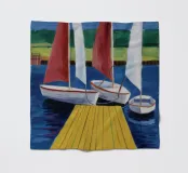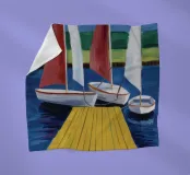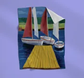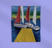 Red and white sailboats rest beside a wooden dock on still water, capturing summer serenity and balance.
