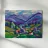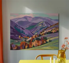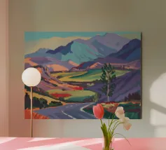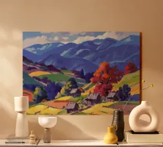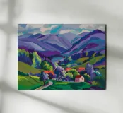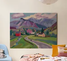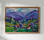 Een kleurrijk landschapsschilderij toont een dorp genesteld op een heuvel met levendige, patchwork-achtige velden in groene, blauwe en paarse tinten, met roodgedekte huizen onder een heldere hemel.