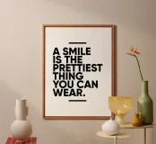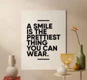 Voeg positiviteit toe aan je interieur met de motiverende muursticker "A Smile Is The Prettiest Thing You Can Wear". Met opbeurende typografie herinnert dit stuk je eraan dat een glimlach een eenvoudige maar krachtige uitdrukking van vreugde en zelfvertrouwen is. Het is gemaakt van hoogwaardige materialen voor duurzaamheid en stijl en is perfect voor thuis, op kantoor of in wellnessruimtes. Dit kunstwerk dient als dagelijkse herinnering om positiviteit te omarmen, waardoor het een ideale aanvulling is op elke omgeving die gericht is op geluk, zelfliefde en emotioneel welzijn.